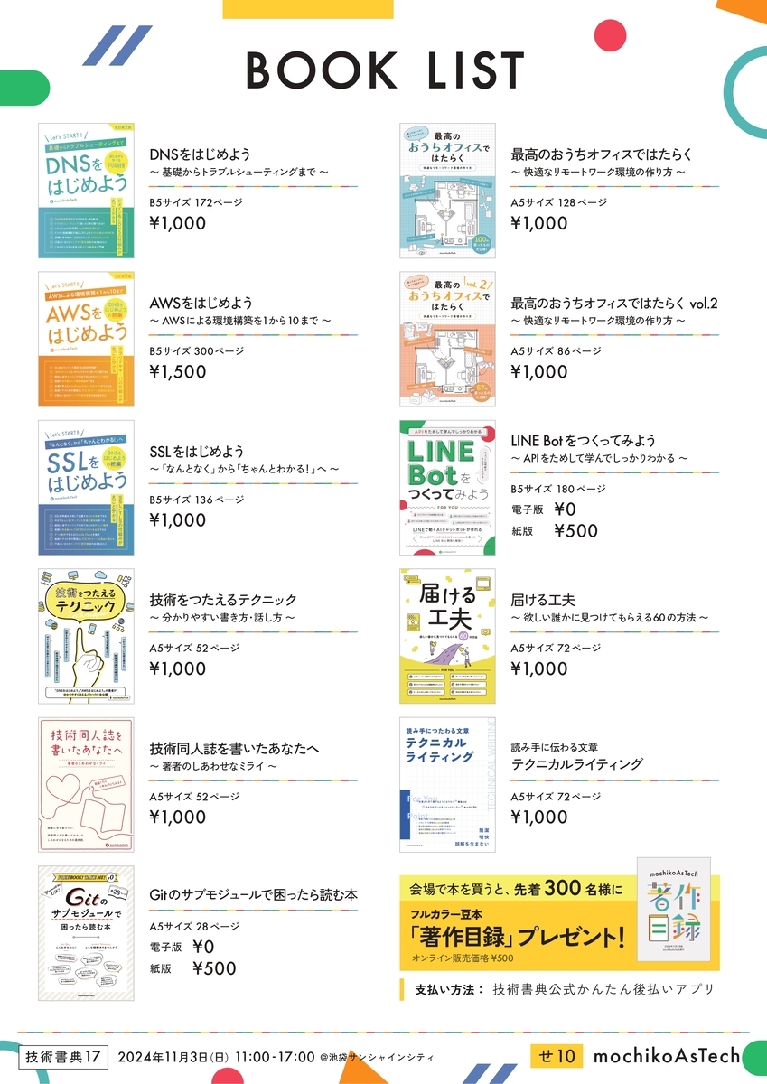 詳しくは後述しますが、11月3日(日) 技術書典のオフライン会場で1冊以上本を買った方に、この「mochikoAsTech 著作目録」を無料で差し上げます。(お一人様1つ。先着順)